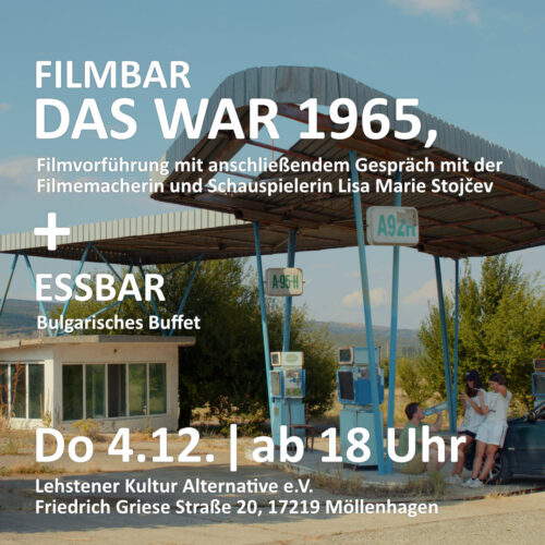 FILMBAR „DAS WAR 1965,“ Filmvorführung mit anschließendem Gespräch mit der Filmemacherin und Schauspielerin Lisa Marie Stojčev ESSBAR Bulgarisches Buffet Donnerstag, 4. Dezember 18 Uhr ESSBAR – 18:45 Uhr FILMBAR –…